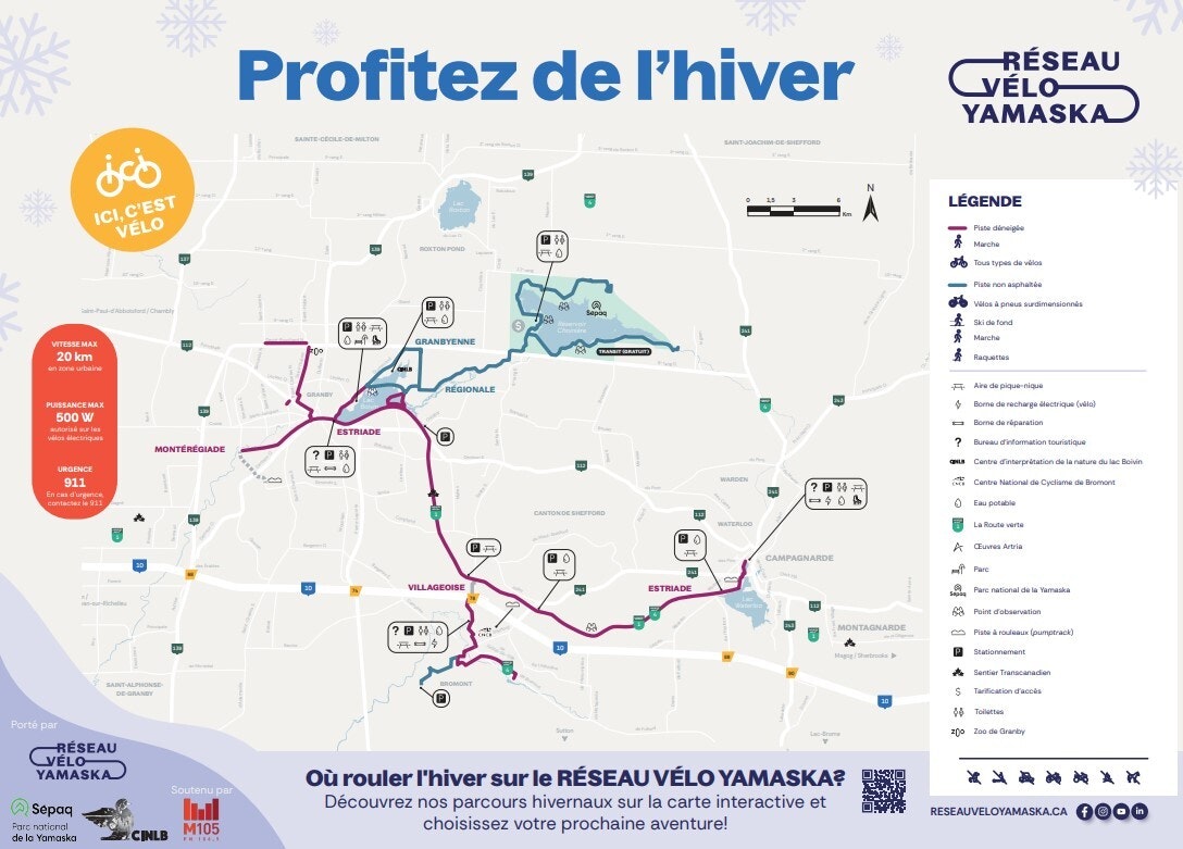 Que l'on recherche une balade estivale au cœur de la nature ou une sortie hivernale en pneus surdimensionnés (fatbike), retrouvez ici toutes les cartes du RÉSEAU VÉLO YAMASKA et le Guide vélo de Granby pour une expérience cyclable optimale.