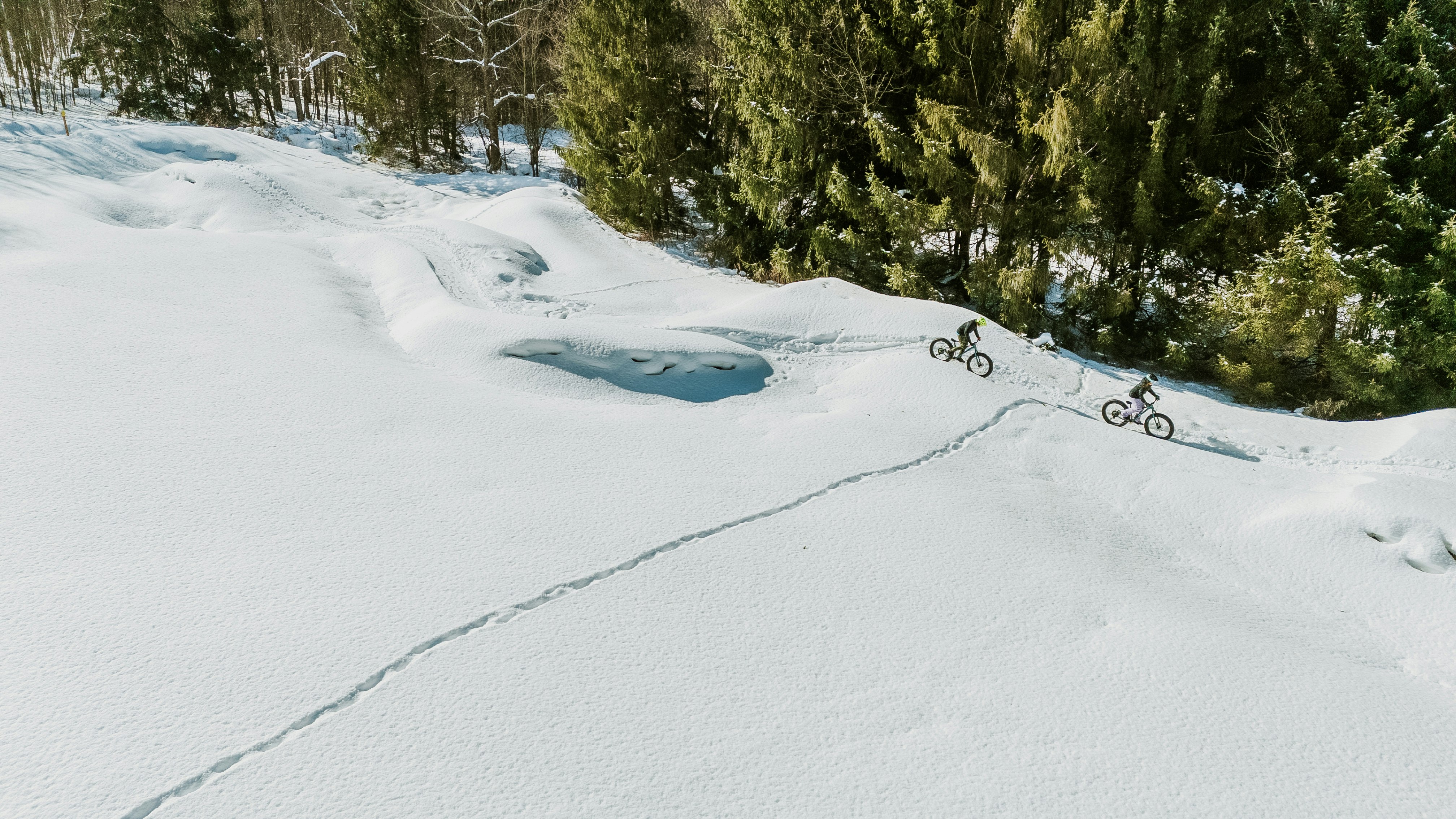 Le vélo à pneus surdimensionnés (fatbike) est un vélo spécialement conçu pour rouler sur des surfaces meubles comme la neige, le sable ou la boue. Ses pneus extra-larges (généralement entre 10 à 13 centimètres) offrent une adhérence et une flottabilité supérieures, ce qui en fait le choix idéal pour les sentiers damés et non déneigés.